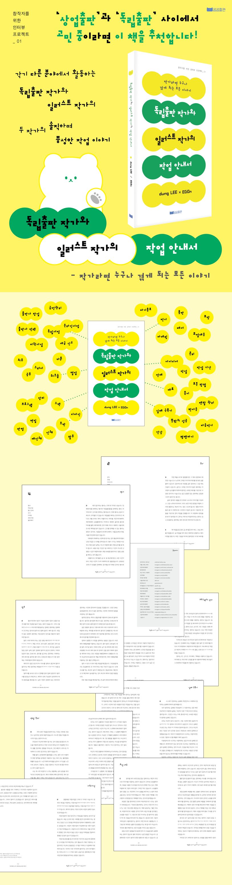 디자인 회사와 출판사를 거쳐 1인 그래픽 스튜디오와 1인 출판사를 운영하는 dung LEE와 취미로 그리던 그림이 직업이 된 일러스트 작가 EGOn. 각기 방향성이 다른 두 작가가 창작의 모든 과정에 대해 솔직하게 적었다. 콘티부터 디자인까지 창작의 전 과정뿐만 아니라 외주, 전시, 행사, 워크숍 등 작가로서 겪었던 다양한 경험, 그리고 멘탈 관리와 SNS 홍보, 금전 관리 등 프리랜서로 활동하면서 얻은 작업 노하우를 소개한다.