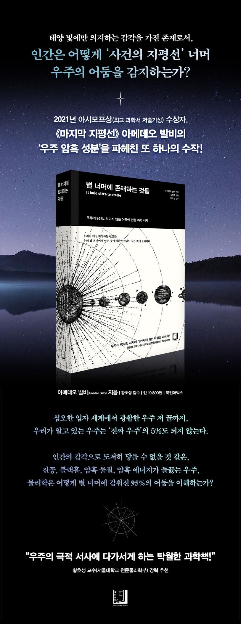 하지만, 저자는 표준 우주 모형의 근간이 되는 암흑 성분이 우주를 설명하는 데 여전히 그럴듯한 대안이며, 관측이 이를 뒷받침하고 있다고 지적한다. 다만, 암흑 성분과 관련해 무언가 놓치고 있을 가능성과 잘못된 전제가 없는지 살펴보는 것은 과학의 본분으로, 성찰적 검증이 필요하다는 것. 이 책은 이 같은 별 너머에 존재하는 어둠에 관해, 과거의 과학자가 그랬던 것처럼 처음으로 돌아가 ‘사건의 지평선’ 밖 보이지 않는 것들의 속성을 재고하며, 이후 전개된 발견과 논쟁의 과정을 담아냈다. 그 시작점은 바로 “왜 밤하늘은 어두운가?”라는 아주 단순한 질문이다. 어쩌면, 이 질문에서 시작해 우주의 기원과 팽창을 이해하고 암흑 물질의 존재를 짐작하게 됐으며, “왜 아무것도 없는 공간은 없을까?”라는 질문으로 눈에 보이지 않는 암흑 에너지의 존재도 추정할 수 있었던 것이 아닌가. 암흑 성분으로 상징되는 우주의 어둠을 쫓다 보면 은유와 직관이 교차하는 아름다운 우주를 만끽할 수 있을 것이다.