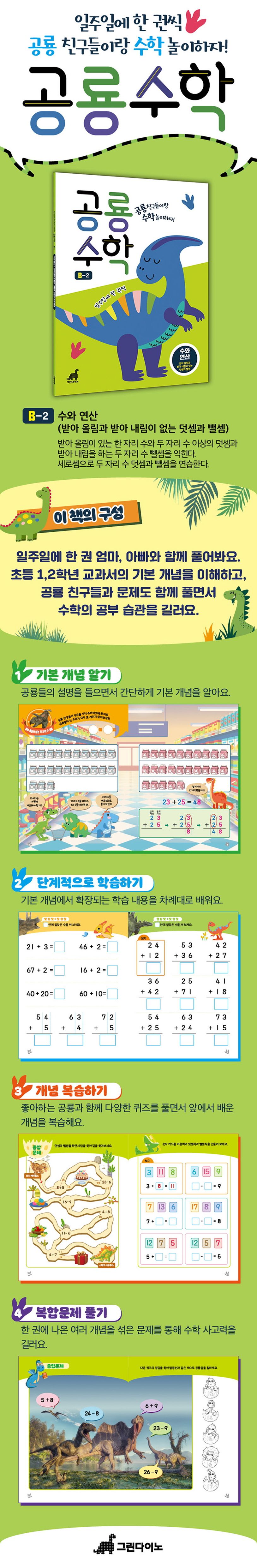 책의특징①초등저학년수학교과서의내용의이해를돕는구성-초등수학을배울때자신감을키워주는연산과도형의내용도함께구성했어요.②개념을이해하는수학-초등저학년에서어려워하는수학개념에대한쉬운설명을공룡친구들로부터듣고이해한다음,놀이로구성된문제들을풀어요.③단계적인학습받아올림과받아내림이없는덧셈뺄셈부터받아올림과받아내림이없는덧셈뺄셈,곱셈과구구단을단계적으로배우고초등저학년에서꼭개념을이해해야하는평면도형에대해배워요.④친근한공룡캐릭터들과신나게수학공부유아들이좋아하는귀여운공룡캐릭터들이수학개념을친근하게설명해요.수학이어려운과목이아니라,친근한과목으로느끼도록해줘요.