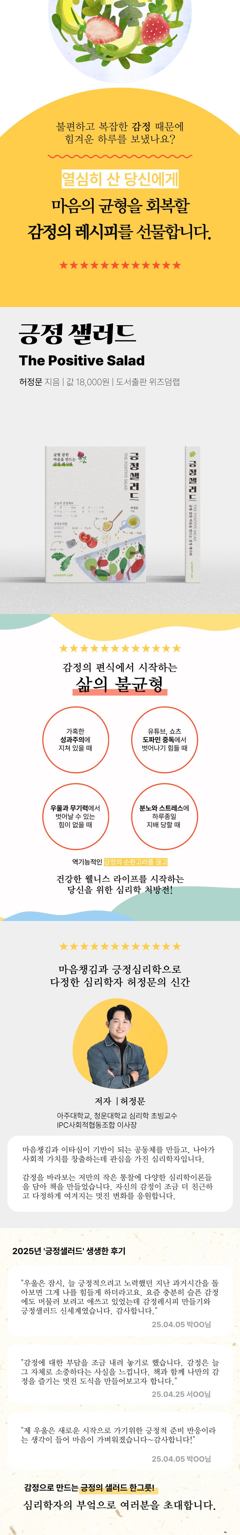 『긍정샐러드』는 감정을 단순한 심리 현상이 아니라 삶의 ‘도구’로 재발견하게 하는 책이다. 이 책은 감정의 무게에 눌려 있던 일상에, 기능적 감정 사용이라는 새로운 가능성을 열어준다. 이 책을 덮는 순간 우리는 감정을 균형 있게 즐기고 삶을 가꾸는 한 사람의 감정 다이어터로 변화했음을 경험하게 될 것이다.