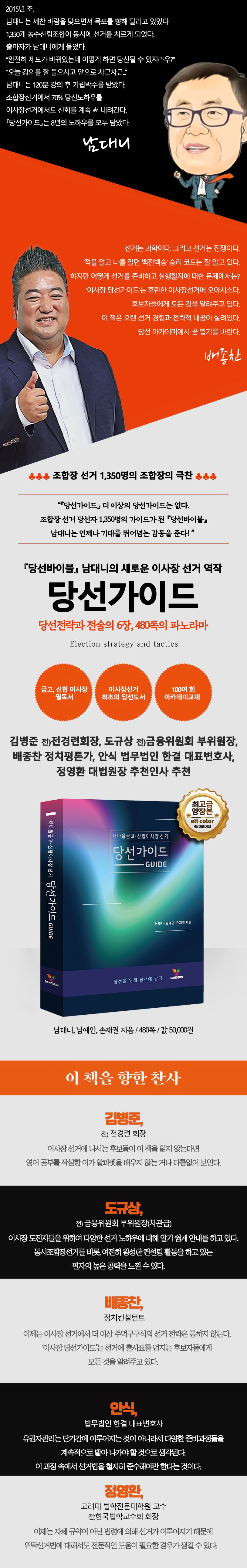 약 500여 쪽에 달하는 이 책은 선거분야에 관하여는 대학 전공서적으로 쓰여도 무방할 정도로 선거의 A to Z가 담겨있다. 〈이사장 선거 당선가이드〉는 포털사이트 네이버에서 쉽게 구매할 수 있다.