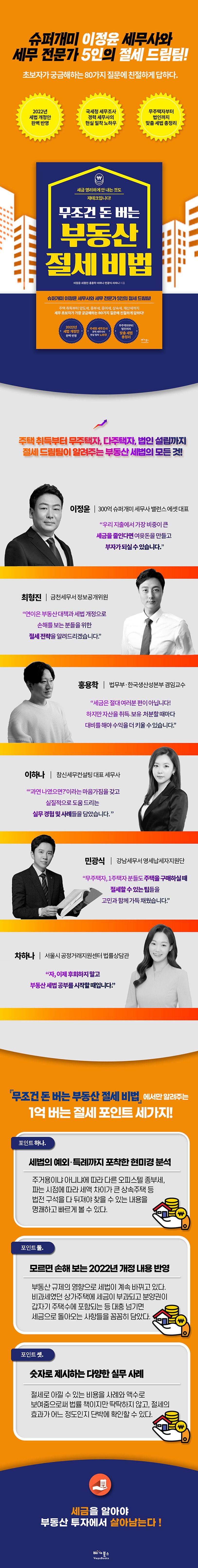 무엇보다도 이 책은 반드시 알아야 할 세금 상식과 절세 방법을 모두 담았다. ‘주식 투자하는 회계사’로 잘 알려진 저자 이정윤 회계사와 최형진, 홍용학, 이하나, 민광식, 차하나 5인의 공저자 회계사들은 지역 세무서와 국세청, 법무부-한국생산성본부 대표세무사 등의 경험을 모두 녹여 최대한 알기 쉽게 내용을 정리했다. 세법을 처음 접하는 독자들도 어렵지 않게 관련 지식을 얻으면서 취득부터 보유, 처분까지 모든 시점에서의 절세 전략을 세울 수 있다.