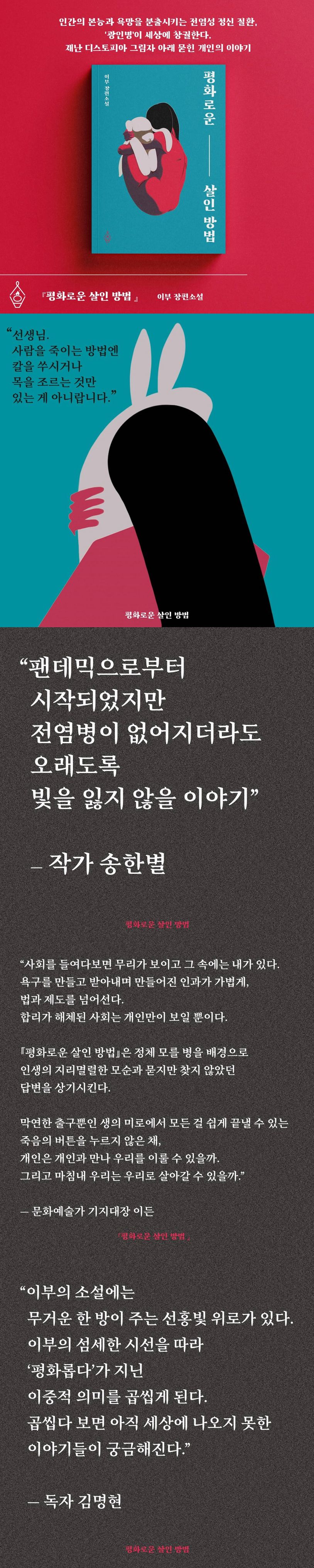 ‘재난 너머엔 개인이 있다. 사건 너머엔 사연이 있다. 욕망 너머엔 감정이 있다.’ 단지 이 사실이 잊히지 않았으면 하는 마음으로 글을 써 내려갔습니다. 지금껏 살아오면서 목격했던 몇몇 재앙은 개인을 무력하게 만들곤 했습니다. 각자 알아서 슬픔을 감내해야 했고, 인내해야만 했습니다. 항상 개인의 미칠듯한 불안과는 무관하게 세상은 잘 굴러만 갔고, 기사 속 살벌한 활자들과는 별개로 내 삶의 굴레도 계속 굴러가기 마련이니까요. 하지만 재난으로 묻히고 잊혔을지언정, 분명 개인에겐 제각각의 여정과 사연이 있습니다. 『평화로운 살인 방법』은 재난 디스토피아 그림자 아래 묻힌 개인의 이야기입니다.