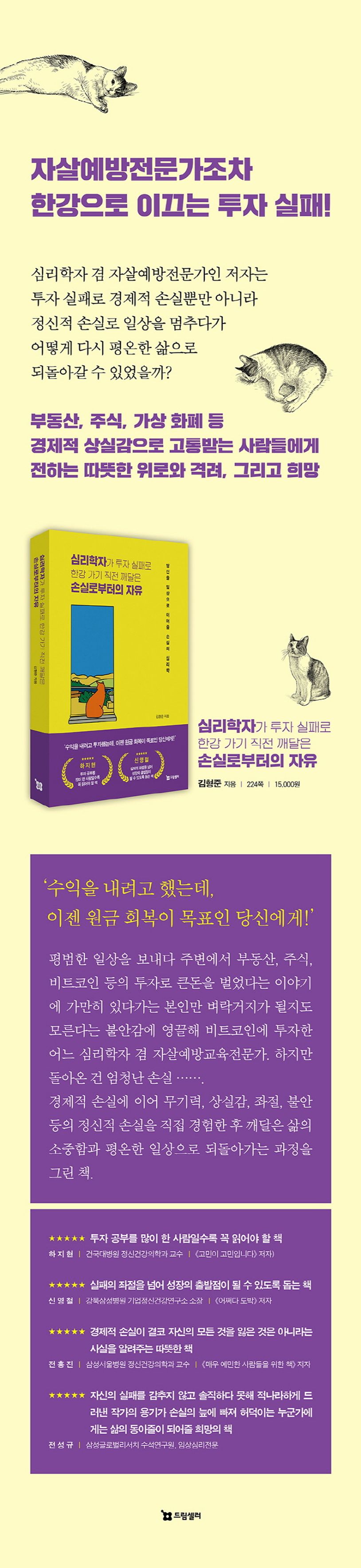 사회적 문제가 되고 있는 부동산, 주식, 가상 화폐 등의 투자 실패와 손실의 과정에서 겪게 되는 심리적 현상을 경험자의 시각에서 생생하게 다루고, 손실로 인한 상실감을 극복하는 과정을 안내하는 책이다. 투자로 많은 수익을 냈다는 주변 사람들의 이야기를 듣고 가만히 있다가는 자신만 벼락거지가 될지도 모른다는 불안감에 투자에 뛰어든 사람들이 많다. 하지만 수익을 내기보다 손실을 경험하는 경우가 훨씬 많다. 손실은 단순히 돈만 잃는 것으로 끝나지 않는다. 손실의 늪에 빠져 건강, 마음, 가족을 잃고 심지어 목숨까지 잃는 경우도 있다. 심리학자이자 자살예방교육전문가인 저자 역시 손실 이후 찾아온 상실감과 절망감으로 모든 것을 내려놓고 싶을 때가 있었다. 이 책은 저자의 생생한 경험을 토대로 손실로 인해 불행하다고 느끼는 수많은 사람들과 마음을 나누고, 돈보다 소중한 것이 무엇인지를 깊이 있게 성찰하는 계기를 마련해 다시 이전의 평범한 일상으로 이끌어준다.
