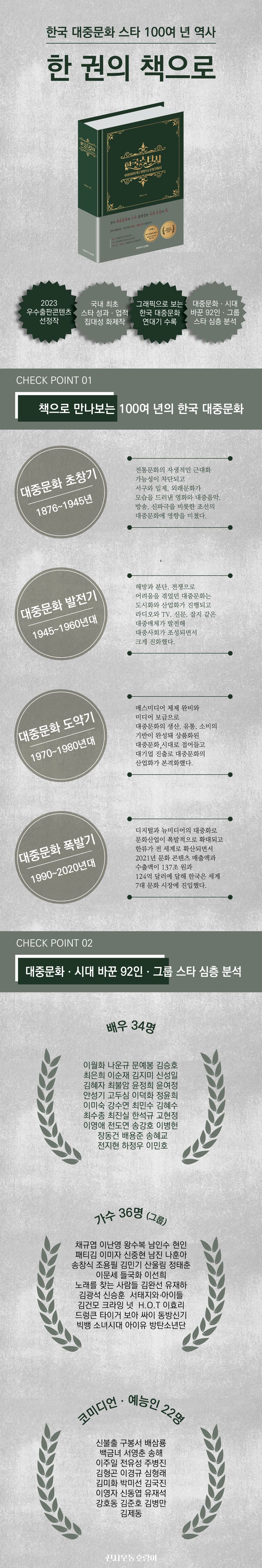 배우는 이월화부터 이민호까지, 가수는 채규엽부터 방탄소년단까지, 코미디언ㆍ예능인은 신불출부터 김제동까지, 한국 대중문화와 시대를 이끈 스타들의 삶과 활동, 성과, 영향을 조명한 국내 유일의 책으로 한국출판문화산업진흥원이 선정한 ‘2023 우수출판콘텐츠’다.