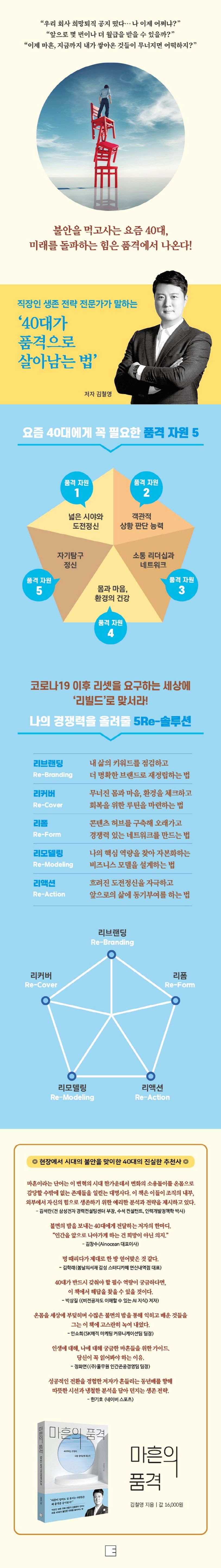 《마흔의 품격》에서는 바로 지금 다시 품격을 갖추어야 한다고 조언한다. 여기서 말하는 품격은 과거의 ‘있어 보이기 위한 품격’이 아니라 ‘어디에 있든 녹아들어 반드시 살아남게 하는 요즘 시대에 맞는 품격’이다. 세대 간의 간극을 넘어 그 누구와도 소통할 줄 알면서 이미 가지고 있는 자신의 핵심 역량을 찾아 더욱 개발해나가는 품격 있는 발걸음만이 40대가 불안한 미래를 돌파하는 비법이라는 것이다.