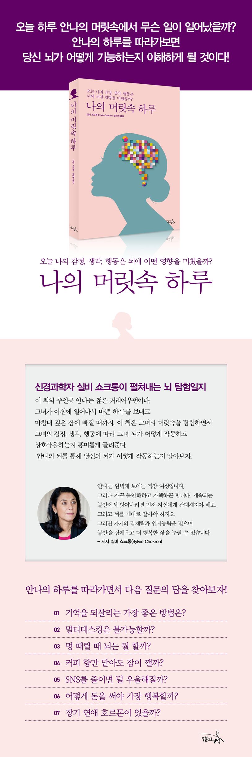 책의 1부에서는 안나의 하루 일상을 보여주고, 2부에서는 안나의 경험과 생각이 매 순간 어떻게 두뇌와 연관되는지 신경과학 관점에서 해독한다. 책에서 소개하는 과학적인 조언들은 일상에서 활용도가 높으며, 건강하고 유능한 뇌를 유지하는 데 크게 도움이 된다.