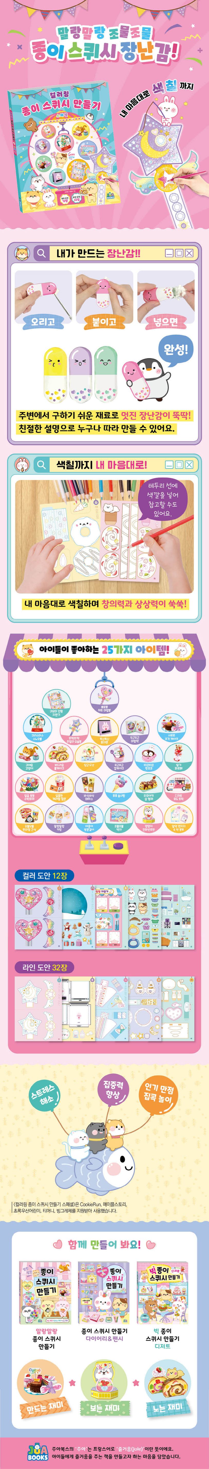 〈컬러링 종이 스퀴시 만들기 스페셜〉에는 컬러 도안 12장, 라인 도안 32장을 담아 만들기뿐만 아니라 색칠까지 할 수 있어요. 뾰로롱 하트 요술봉, 크리스마스 스노우볼, 귀요미 인형 자판기와 같이 새로운 아이템과 사르르 조각 케이크, 딸기 파르페, 멍멍이 전화번호판 등 앞 시리즈에서 가장 사랑받은 아이템을 엄선해 담았어요. 흔히 구할 수 있는 테이프, 솜만 있으면 내가 가지고 노는 장난감을 내 손으로 뚝딱 만들 수 있지요. 내가 직접 만든 장난감은 가게에서 파는 장난감과는 다른 특별한 매력이 있어요.