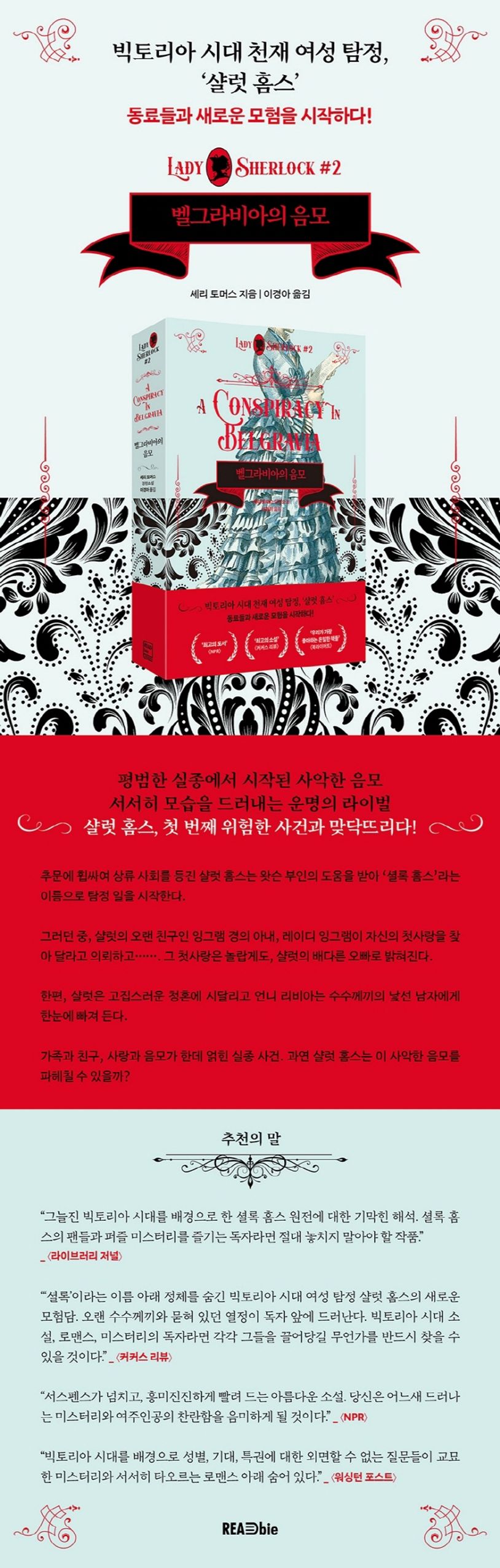 ‘셜록 홈스’의 재능을 지닌 여성이 빅토리아 시대에 살고 있다면 어떤 일이 일어날까? 빅토리아 시대 여성의 한계를 셜록 홈스라는 불후의 고전으로 풀어낸 ‘레이디 셜록 시리즈’, 그 두 번째 작품 《벨그라비아의 음모》가 국내에 소개된다.