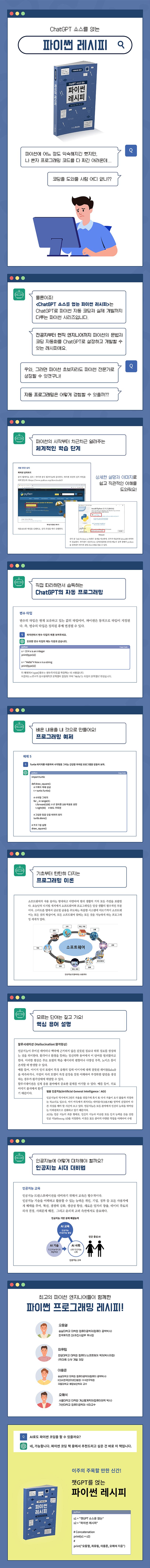 ●특징: 챗GPT를 이용하여 코딩과 개발과정, 결과물을 내용에 그대로 반영되어 있어서 전공자, 현직 엔지니어에 파이썬을 배우려는 초보자까지 학습 가능한 전문서적임