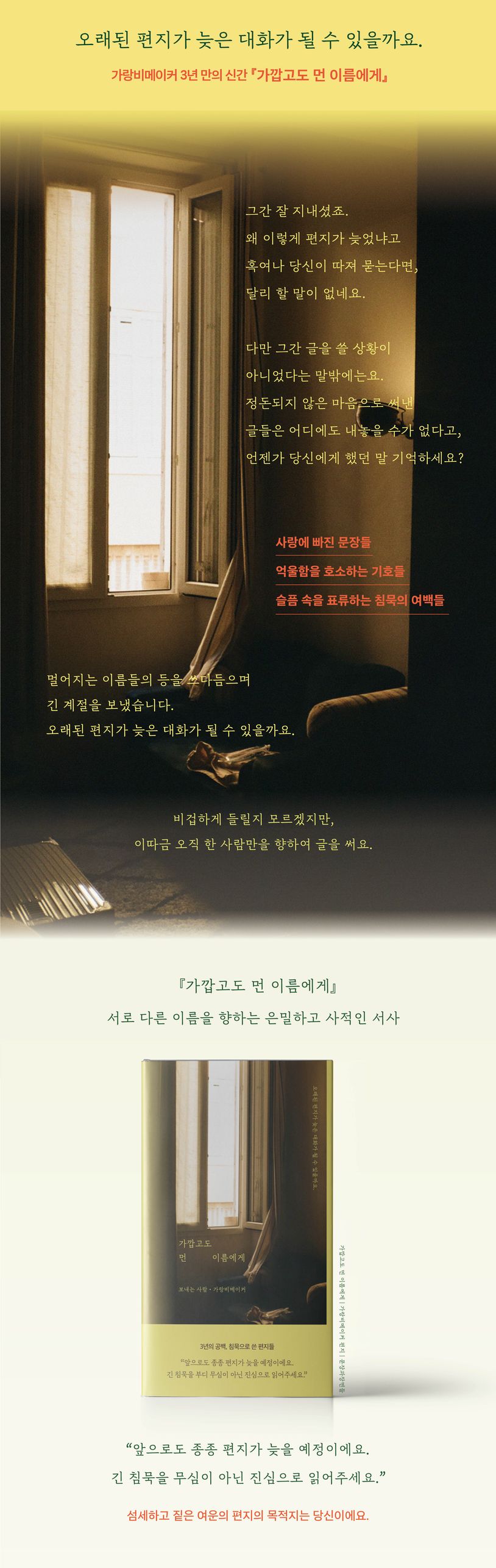 가랑비메이커의 3년 만의 신간 『가깝고도 먼 이름에게』는 3년이라는 공백의 시간을 통해 침묵으로 쓴 편지들의 집합이다. 매일 모니터 앞에서, 사람들 앞에서 수많은 문장을 내놓아야 하는 작가라는 직업에 대한 깊은 사유를 하던 어느 계절, 우연히 발견한 부치지 못한 편지들에서 책 『가깝고도 먼 이름에게』가 시작되었다.
