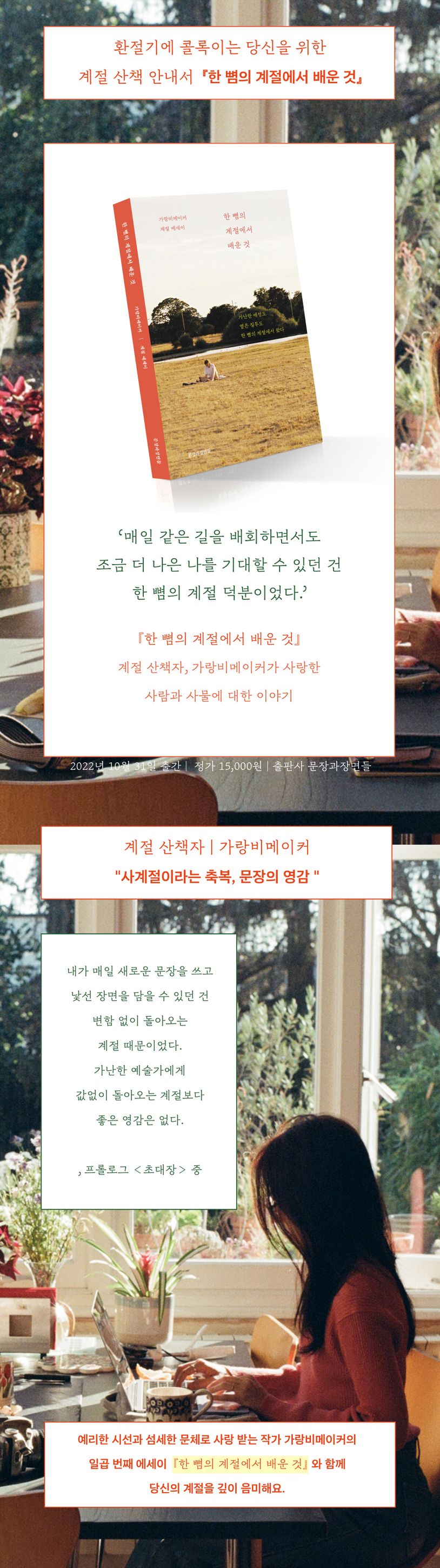 가을을 마중하며 펴내는 책 〈한 뼘의 계절에서 배운 것〉은 작가 가랑비메이커가 사계절을 머물며 마음껏 산책하고 마주했던 사람과 장면들에 대한 깊은 사유의 산문집이다. 사계절이 분명한 곳에서 나고 자라며 당연하게 마주했던 변덕스러운 계절이 가난한 예술가에게는 더할 나위 없는 영감이 되었다는 가랑비 작가, 낮에는 산책을 하고 밤에는 문장을 쓰는 단조로운 삶에 색과 향을 더해준 계절의 목소리. 환절기 앞에서 언제나 어리둥절한 당신에게 바치는 진하고 깊은 계절의 이야기.