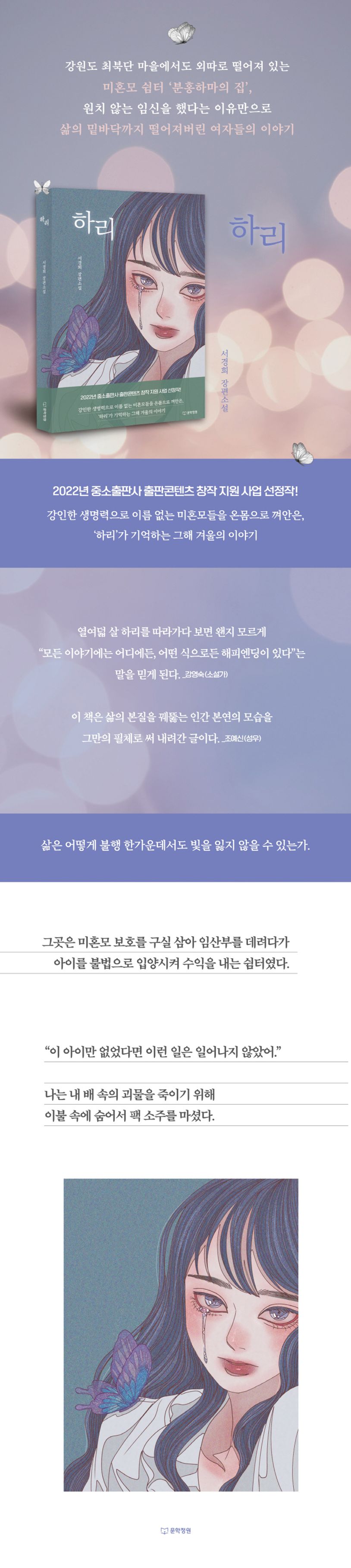 2015년 김유정 신인문학상 수상으로 데뷔하여 지금까지 꾸준히 무언가를 상실하거나 사회로부터 소외된 자들을 그려온 서경희 작가의 장편소설. 2022년 중소출판사 출판콘텐츠 창작 지원 사업에서 심사위원의 압도적인 지지를 받으며 선정된 《하리》는 우리 사회가 지금껏 외면해왔던 미혼모들의 삶에 강인하지만 동시에 사려 깊은 필체로 생기를 불어넣고 있다.