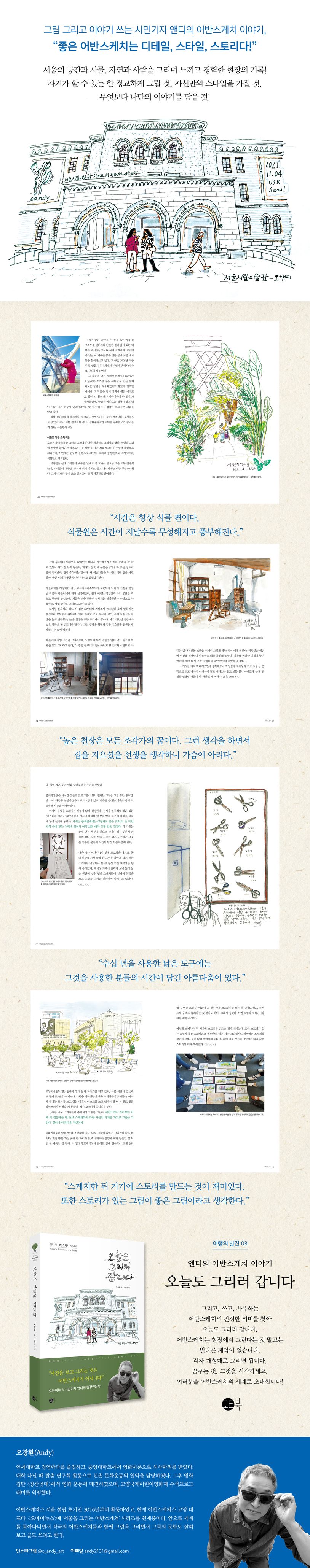 누구나 자기만의 역사가 있다. 남에게 평범해 보이는 장소가 자신에게는 가장 중요하고 소중한 이야기가 될 수 있다. 어반스케치는 그런 이야기를 풀어 놓는 것이다. 작가는 이 에세이를 통해 어반스케치의 기본 정신을 담담하게 전하면서도 소소한 우리의 일상이 어반스케치를 통해 어떻게 특별해질 수 있는지 보여준다. 어반스케쳐의 솔직함과 현장감이 넘치는 이 기록들은 오마이뉴스에 1년 넘게 연재한 칼럼 중 55편을 추려 글과 사진을 보충하여 엮은 것이며, 앤디의 어반스케치 이야기는 지금도 현재 진행형이다.