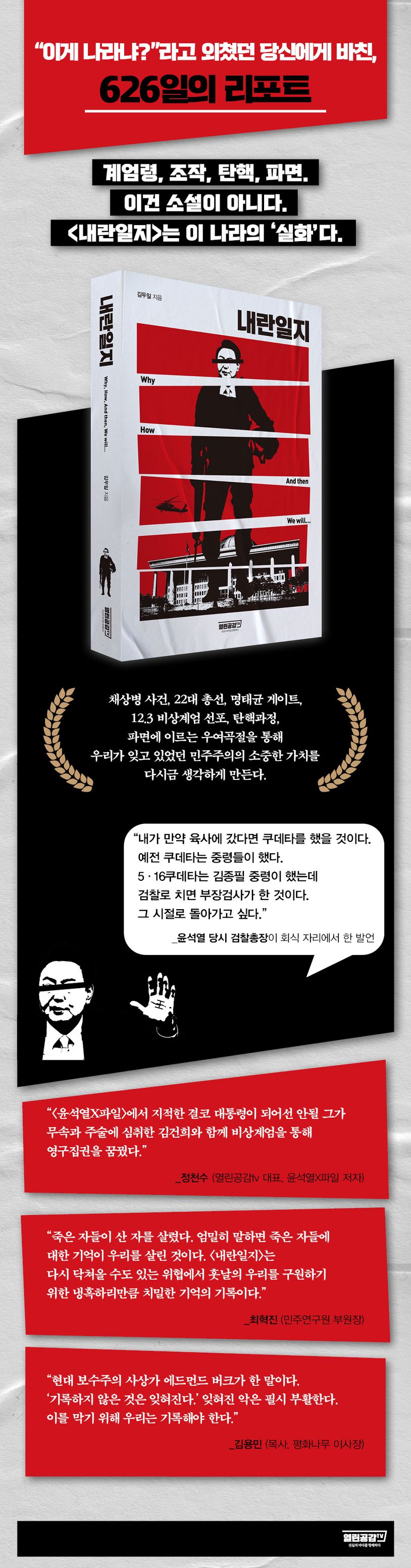 〈내란일지〉는 총 626일간의 기록이다. 이 책은 단지 12.3 비상계엄 선포와 윤석열 대통령 탄핵과정만을 기록하지는 않았다. 채상병 사건 발생과 정부의 은폐 의혹, 그로인한 22대 총선의 결과, 윤석열 정권이 본격적으로 흔들리게 된 명태균 게이트, 끔찍했던 12.3 비상계엄의 밤과 그 전후의 긴박했던 순간들, 지루하고 힘들었던 헌법재판소의 탄핵심판 과정, 모두가 환호했던 파면결과까지 수많은 우여곡절을 기록한 책이다. 이를 통해 한동안 우리가 잊고 있었던 민주주의의 소중한 가치가 재조명 되기를 바란다.
