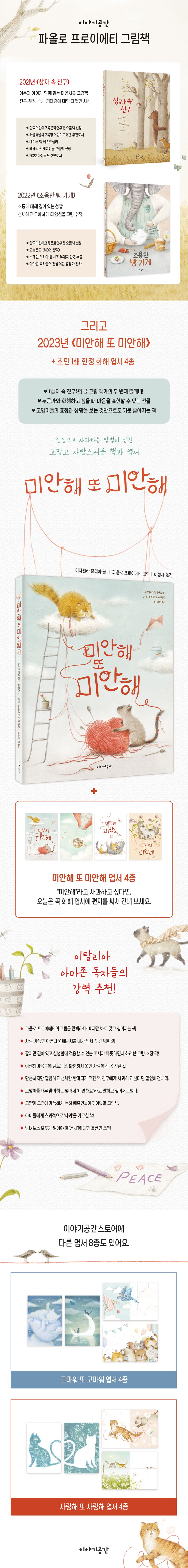 누군가와 화해하고 싶을 때, 말없이 건네는 것으로 마음을 전할 수 있는 그림책 《미안해 또 미안해》가 이야기공간에서 출간되었다. 2021년 《상자 속 친구》를 시작으로 이야기공간은 이 책의 그림 작가 파올로 프로이에티의 작품을 해마다 1권씩 출간해 왔다. ‘마음치유’를 모토로 삼고 있는 이야기공간과 결이 맞는 따뜻한 그림체가 이번에도 우리를 위로한다. 1차 타깃 독자인 어린이에게 효과적으로 ‘사과’를 가르치고, 남녀노소 모두가 알아야 할 ‘용서’에 대한 훌륭한 조언이 담겨 있다.