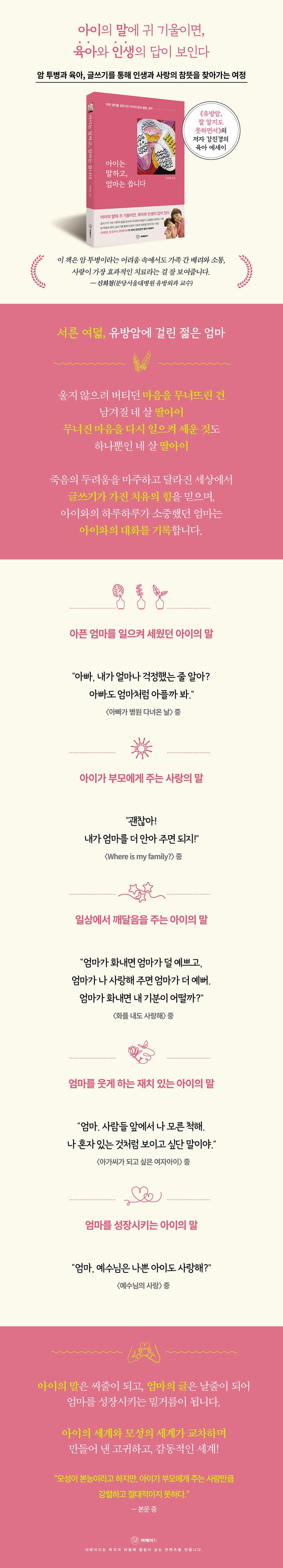 저자는 죽음의 두려움을 마주하고 달라진 세상에서 글쓰기가 가진 치유의 힘을 믿으며, 아이와의 소중한 매일의 대화를 기록한다. 아이의 보석같은 말들을 놓치지 않기 위해 스마트폰 메모장과 녹음 기능을 이용해 가면서 부지런히 기록하고 꾸준히 글을 쓴다. 아이의 말은 씨줄이 되고, 엄마의 글은 날줄이 되어 가족의 아픔을 포근하게 감싸는 담요가 되고, 엄마를 성장시키는 밑거름이 된다. 이 책에는 아이의 세계와 모성의 세계가 교차하며 만들어 낸 고귀하고 감동적인 세계가 담겨 있다. 저자는 “모성이 본능이라고 하지만, 아이가 부모에게 주는 사랑만큼 강렬하고 절대적이지 못하다”고 말한다.