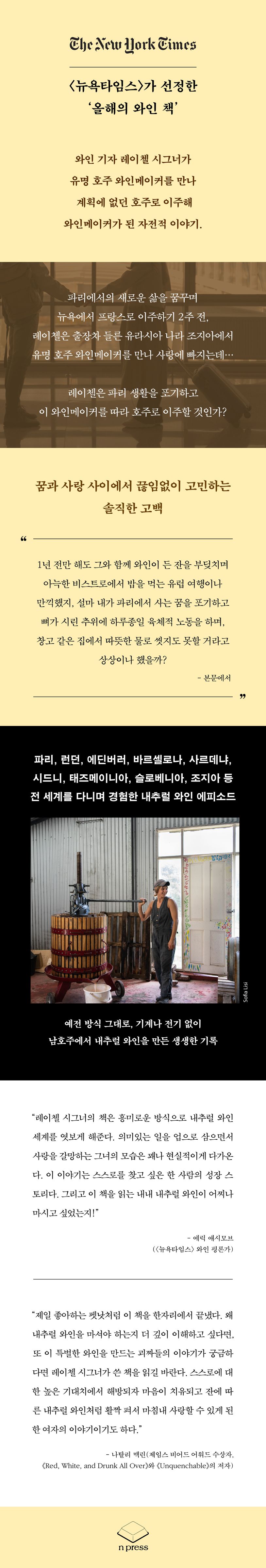 와인 기자 레이첼 시그너가 유명 호주 와인메이커를 만나 계획에 없던 호주로 이주해 와인메이커가 된 자전적 이야기.