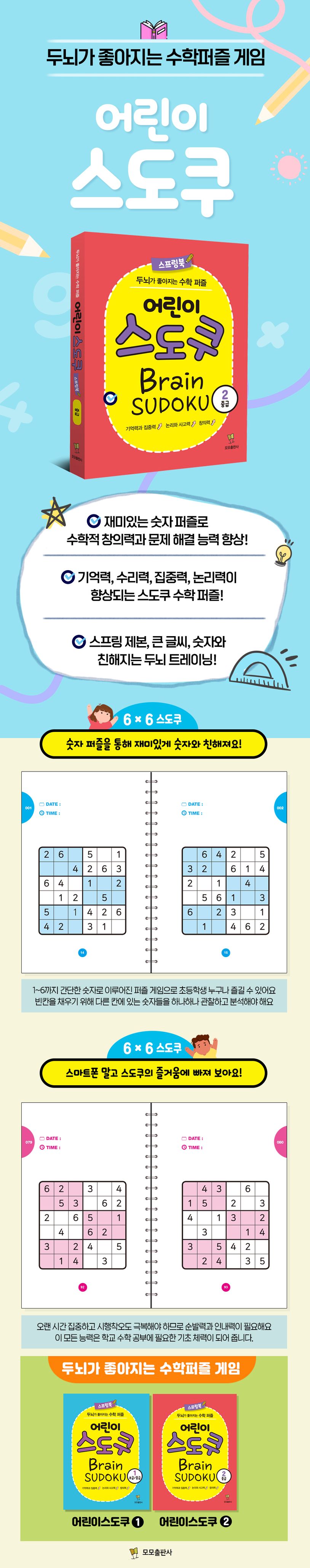 이 책은 미취학 아동부터 초등학생까지 어린이의 눈높이에 맞춰 난이도를 조절했습니다. 초급용을 쉽게 푸는 아이들을 위해, 중급용으로 6×6 퍼즐을 준비했어요. 책머리에는 스도쿠 퍼즐을 푸는 방법을 친절하고 자세하게 소개했고요. 손동작이 미숙한 어린이들을 위해 퍼즐의 네모 칸을 넉넉하게 디자인했어요. 스프링 제본으로 되어 있어 페이지를 넘기기 쉽고 숫자를 편하게 쓸 수 있답니다.