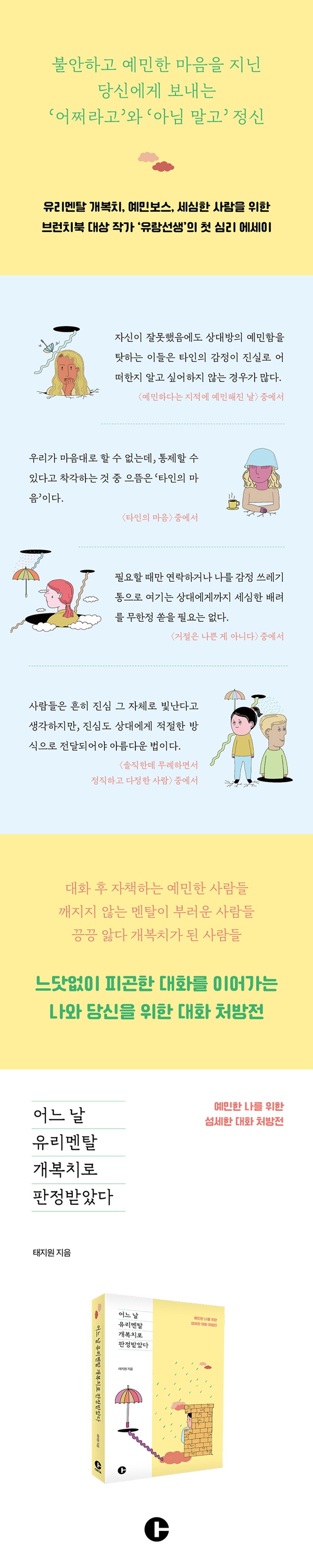 “그냥 나대로 살 순 없을까?” 뒤끝 없는 시대, 쿨한 시대를 살아가면서 마음앓이하는 유리멘탈 개복치, 예민보스를 위한 실존 처방 에세이. 매주 ‘유랑선생’이라는 이름으로 브런치에 다양한 글을 연재하고 있는 저자 태지원이 불안한 마음, 불편한 마음, 소심한 마음, 때론 질투와 원망 등 일상생활에서 느끼는 다양한 감정을 예민한 사람, 속칭 ‘유리멘탈 개복치’의 시각에서 풀어냈다. ‘유리멘탈’ 혹은 ‘개복치’는 겉으로는 괜찮은 척 보이나 사소한 감정에 쉽게 휘둘리는 사람을 의미한다. 본인을 유리멘탈이라고 여기며, 나약한 마음과 멘탈로 버티며 살아온 저자는 나름의 대화 처방전을 제시한다. 카카오톡 대화를 끊지 못해 괴로웠던 지난날, 벼락치기조차 실행하지 못해 원망스러웠던 자신을 뒤로하고 ‘나에게 너그럽게 대하기’ ‘게으른 완벽주의자임을 인정하기’ ‘내 감정을 의심하지 말기’ 등의 사소하고 실용적인 팁이다.
