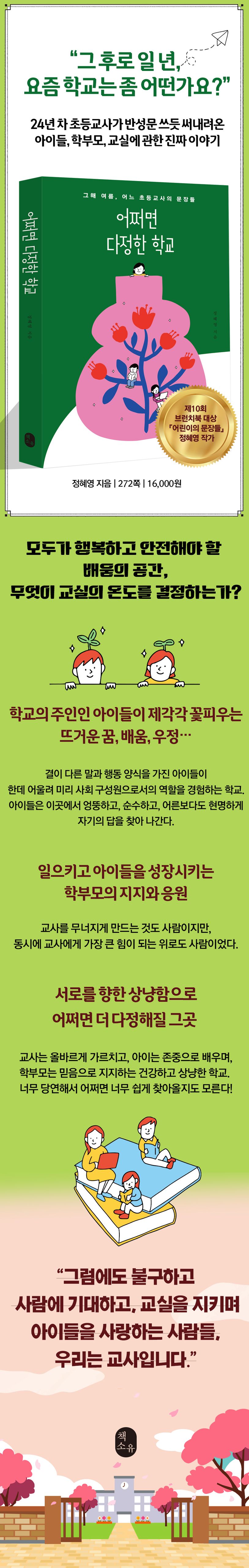 이 일을 계기로, 2023년 브런치북 대상 수상자이자 20년 넘게 교직생활을 해온 정혜영 작가는 『어쩌면 다정한 학교』를 출간했다. 훌륭한 동료를 지켜주지 못했다는 자책감으로, 더 나은 공교육을 위해 힘을 보태고자 그동안 학교에 관해 써온 글들을 모은 것이다.