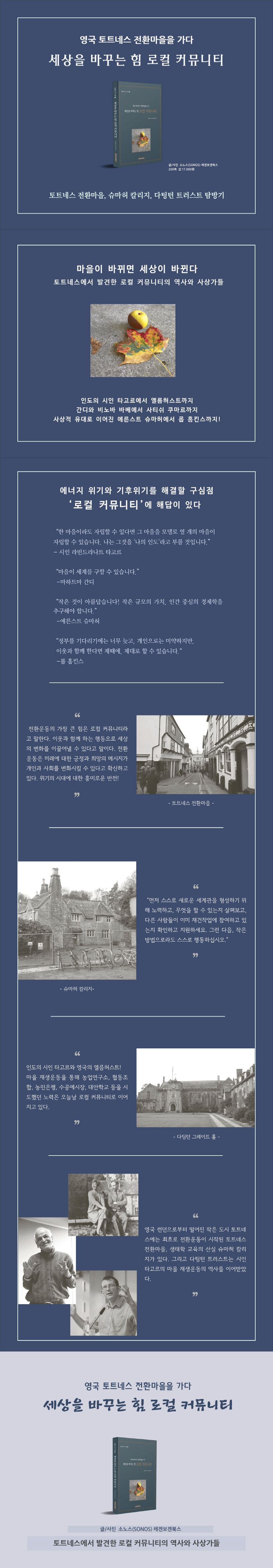 이 책은 영국 데본 주의 토트네스 마을을 방문하고 쓴 탐방기이다. 토트네스 전환마을과 슈마허 칼리지를 찾아 간 여행에서 다팅턴 트러스트를 알게 되면서 인도의 타고르에서 롭 홉킨스로 이어지는 로컬운동의 사상적 계보를 발견하게 된다. 토트네스에서 ‘마을이 바뀌면 세상을 바꿀 수 있다.’는 통찰력으로 시대를 넘나들며 로컬운동을 펼쳤던 사상가들을 만난다. 또한 오늘날에도 인류를 지속가능한 미래로 이끌어 주고 있는 활발한 로컬운동의 현장을 볼 수 있다.