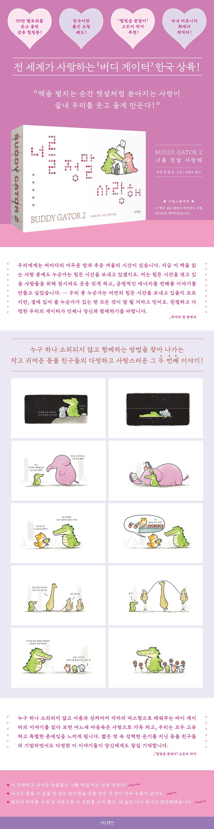 마음이 움츠러들 때, 부족한 나의 모습에 자신감이 떨어졌을 때, 언제나 밝고 환한 모습으로 등장해 웃음과 감동을 주는 다정한 악어 ‘버디 게이터’. 저자는 힘든 시간을 보내고 있을 사람들의 얼굴에 미소를 선물해주고 싶어 이 시리즈를 만들게 되었다고 한다. 버디 게이터의 다정하고 귀여운 힐링 스토리는 어린아이부터 어른까지, 90만 팔로워를 사로잡으며 연일 극찬의 댓글과 함께 전 세계 사람들의 열렬한 사랑을 받고 있다. 5개 언어로 번역 출간된 버디 게이터 시리즈는 이번에 첫 한국어판으로 《BUDDY GATOR 1_너를 만나서 행복해》와 《BUDDY GATOR 2_너를 정말 사랑해》로 1, 2권이 동시 출간되었다. 저자가 베스트 에디션으로 꼽는 이번 한국어판에는 한국 독자들에게 전하는 저자의 말이 담겨 있으며, 스토리의 감동과 여운이 잘 전달될 수 있도록 사철 방식으로 특별 제작되었다.