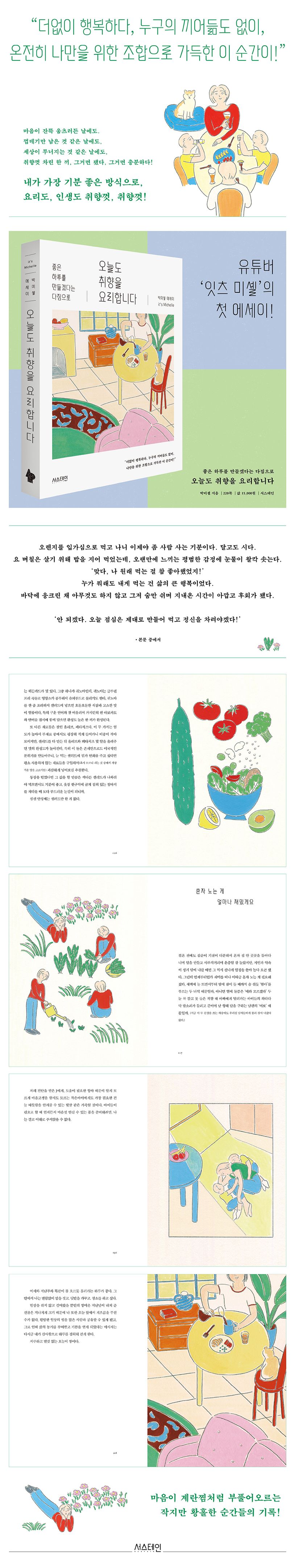 잇츠 미셸의 첫 에세이인 이 책에서는 요리와 음식에 얽힌 이야기들, 그리고 그간 영상에서는 전하지 못했던 좀 더 내밀한 일상의 기록들을 요리하는 모습만큼이나 유쾌하면서도 따뜻하게, 정성껏 담아냈다. 구독자들이 요리하는 모습을 지켜보다가 점점 그의 삶의 모습에 빠져드는 것처럼, 책을 읽다 보면 맛깔 나는 묘사에 침이 고이고, 거침없는 입담과 유머에 키득키득 웃다가도, 어느 순간 눈물이 맺히고, 끝내 마음이 계란찜처럼 부풀어오르는 작지만 황홀한 감동을 느낄 수 있을 것이다.