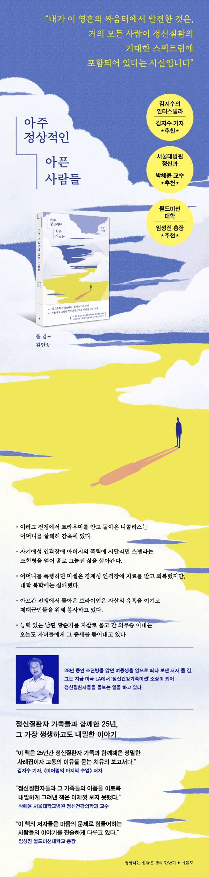조현병 환자인 여동생을 암으로 떠나보낸 저자 폴 김이 지난 25년간 정신질환자 가족들을 돌보며 겪은 이야기를, 미국에서 활동한 저널리스트 김인종과 함께 썼다. 폴 김은 여동생이 조현병을 앓기 시작한 후 목사가 되기로 결심하고 미국에서 목회학 박사학위를 받은 뒤, 현재 LA에서 ‘정신건강가족미션’(www.mhfmus.org) 소장으로 일하고 있다. 이 책은 폴 김과 여동생의 이야기를 비롯해 우리 주변의 평범한 이웃, 부모와 자식, 형제자매, 부부간에 주고받는 전염병 같은 갖가지 정신질환을 실화를 바탕으로 생생하게 파헤치고 있다.