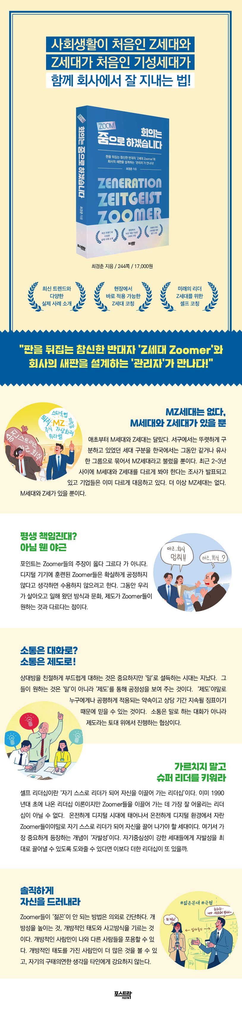 『회의는 줌(ZOOM)으로 하겠습니다』는 직장 내에서 기성세대와 Z세대 사이의 원활한 소통법과, 현장에서 바로 적용 가능한 Z세대 코칭법을 담은 책이다. 인문학적 고찰과 다양한 사례 제시를 통해 ‘세대 갈등 없는 조직 문화 구축’의 틀을 제시하고 있다. 한 발 더 나아가 차세대 리더를 꿈꾸는 Z세대를 위한 셀프 코칭법 또한 함께 담고 있다.