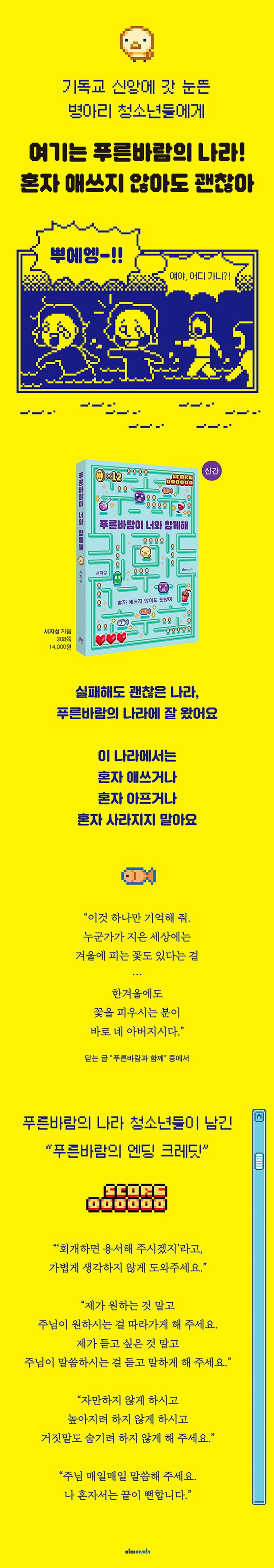 맞다. 교회 문턱을 넘었다고 끝이 아니다. 오히려 진짜 이야기는 그때부터 시작된다. 전작 《푸른바람이 너를 기다려》가 청소년에게 기독교를 소개하고 ‘실패해도 괜찮은 나라’로 초대했다면, 《푸른바람이 너와 함께해》는 푸른바람의 나라에서 즐겁고 풍성하게 살아가는 방법을 알려 준다.