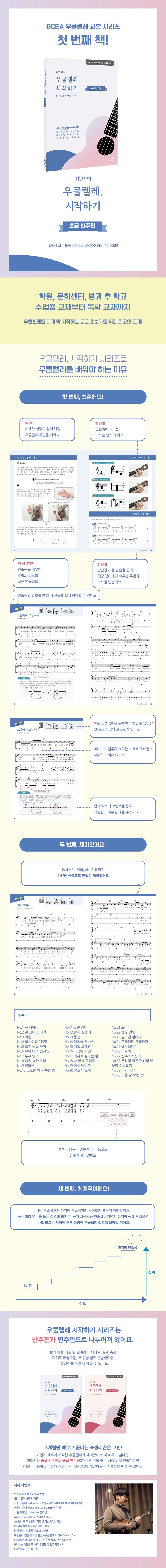 CHAPTER1.우쿨렐레기초상식상식1.우쿨렐레의역사상식2.우쿨렐레의종류상식3.우쿨렐레의구조상식4.우쿨렐레의기본자세상식5.우쿨렐레의튜닝방법상식6.코드를잡기전에알아야할것들상식7.음악기호CHAPTER2.4비트엄지스트로크No.1곰세마리No.2열꼬마인디언CHAPTER3.4비트검지스트로크No.3비행기No.4올챙이와개구리반주편X연주편Collaboration1.징글벨CHAPTER4.8비트다운/업스트로크No.5조개껍질묶어No.6유얼마이선샤인No.7누구없소CHAPTER5.3/4박자리듬&헛스트로크No.8생일축하노래No.9옹달샘No..10고요한밤거룩한밤CHAPTER6.8비트투/포악센트리듬&오른손뮤트No.11울면안돼No.12밤이깊었네No.13풍선반주편X연주편Collaboration2.즐거운나의집CHAPTER7.8비트싱코페이션리듬No.14여행을떠나요No.15매일그대와No.16나성에가면CHAPTER8.셋잇단음표리듬No.17리자로끝나는말No.18나항상그대를No.19여수밤바다CHAPTER9.셔플/스윙리듬No.20알로하오에No.21드라마No.22벚꽃엔딩CHAPTER10.컷팅No.23밤이면밤마다No.24오블라디오블라다No.25셀러브리티No.26아로하반주편X연주편Collaboration3.이치비치티니위니옐로폴카닷비키니CHAPTER11.롤스트로크&룸바리듬No.27진주조개잡이No.28우리의밤은당신의낮보다아름답다CHAPTER12.아르페지오No.29비와당신No.30오랜날오랜밤