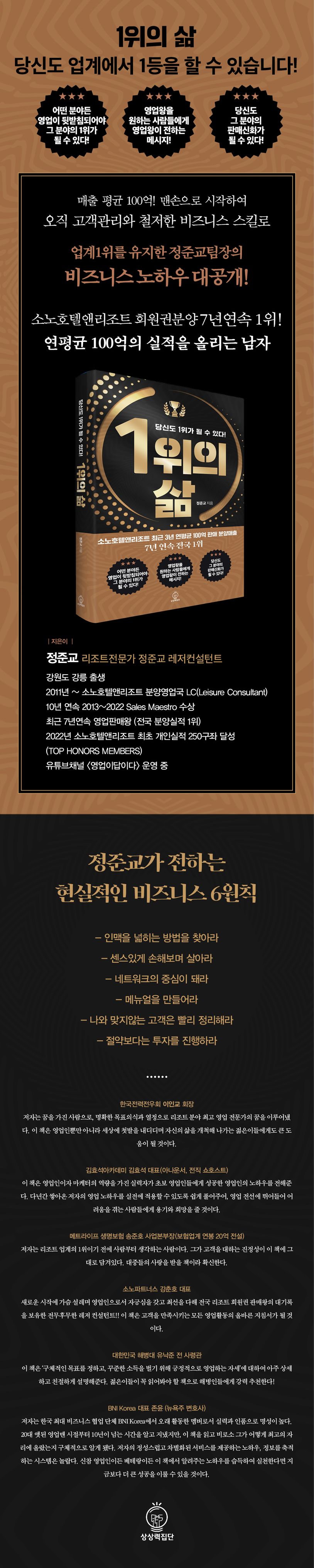 누구나 비즈니스는 어려워하는 영역이라고 생각한다. 또 하기 싫어하는 것 또한 마찬가지이다. 하지만 그 힘든 고개를 하나만 넘어가면 1위의 문턱에 다다른다고 저자는 얘기한다. 어느업종이건 최고가 되기위해선 사람들을 상대해야 하고, 고객이건 협력사이건 그 사람들을 대하는것엔 항상 일관되게 최선을 다해야 좋은결과가 나온다. 아주 구체적이고 상세하게 본인의 경험을 토대로 작성한 내용은 많은 독자에게 성공하는 길을 열어줄 것 이다.