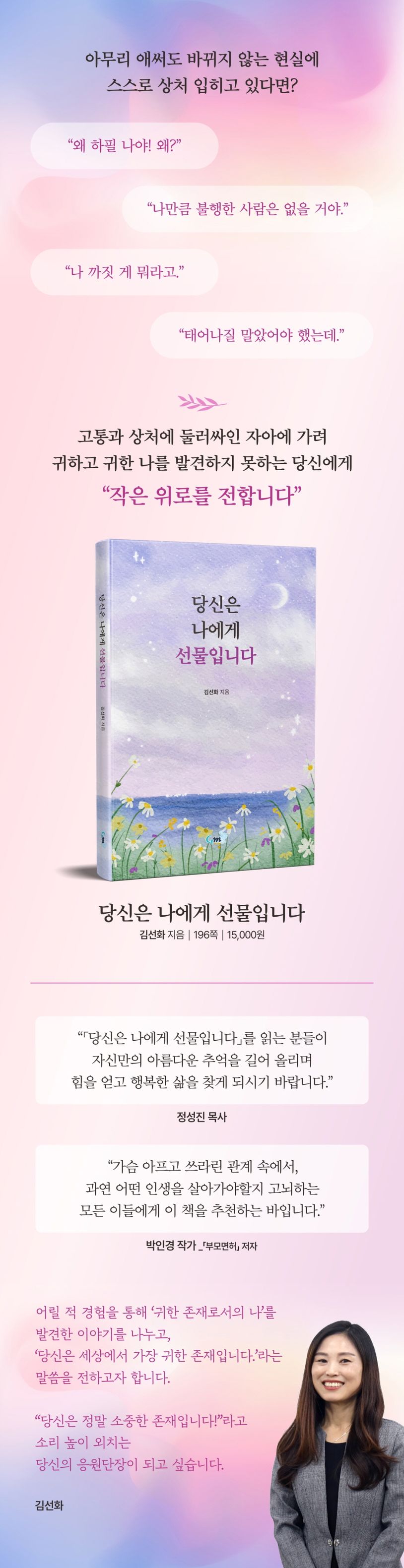 저자는 외로웠던 어린 시절 실타래처럼 얽힌 가족관계 안에서도 자연이라는 선물을 통해 위로와 힘을 얻었을 뿐만 아니라 하나님과 소통하는 창구가 되었다. 고통 가운데서도 ‘나’라는 존재가 유일무이한 귀하고 귀한 존재임을 깨닫고 이 땅에 살아가는 모든 사람은 자신처럼 귀한 존재라고 한다.