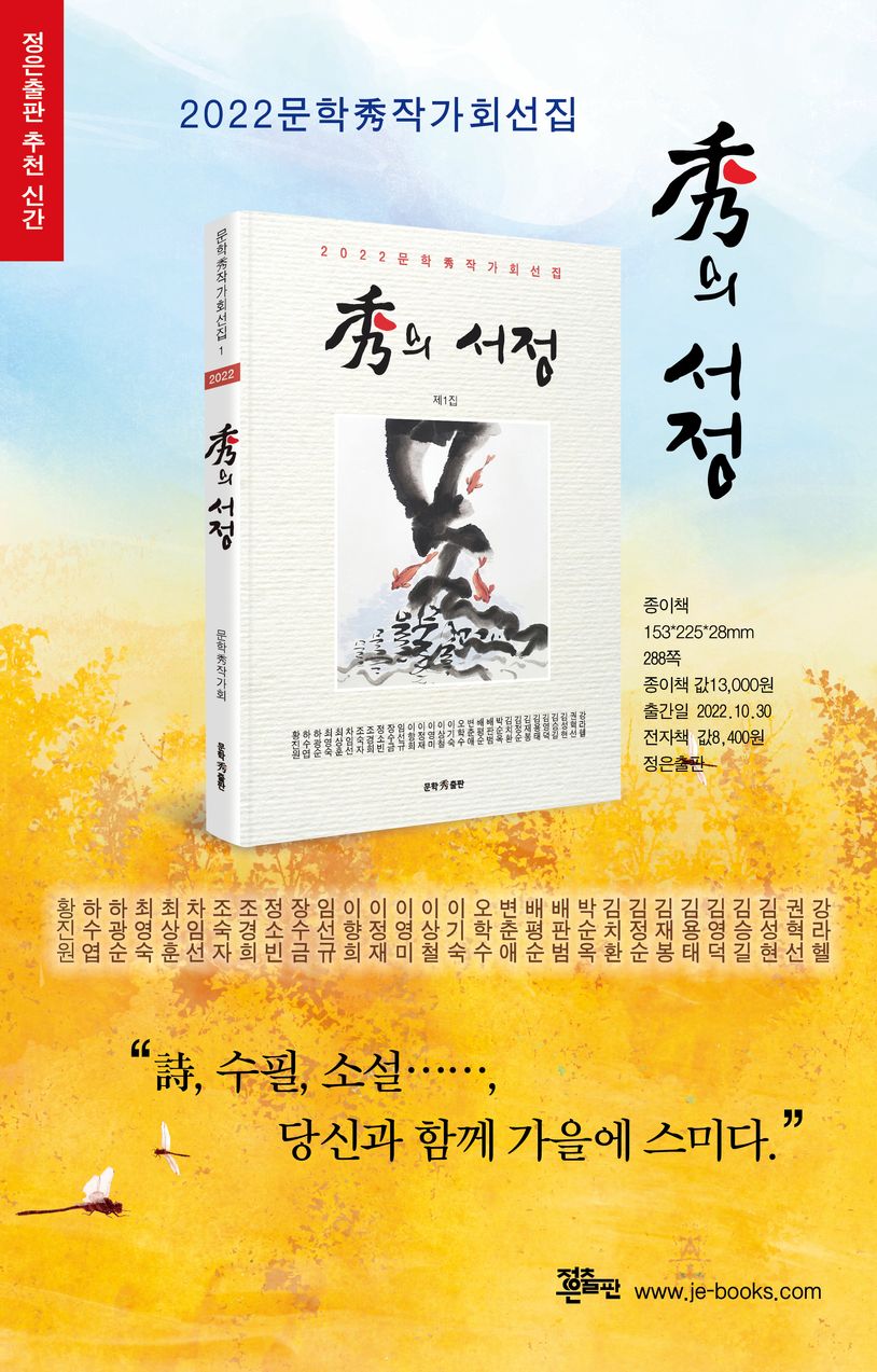 여는시_웅녀熊女의말 김종교수3발간사_문향만리,이정표를세우며이향희문학秀작가회회장6축시_〈秀의서정〉창간을축하드립니다 권순자문학秀문인회장8초대수필_가족 박원명화14추모글故이한준수필가를회고하며 19故이한준작가님을추모합니다!! 27시 권혁선_선생님을만나다외2편 30 김성현_순한올리브외2편 36 김용태_노거수老居樹외2편 42 김재봉_엄마가왔다가셨나외2편 46 김정순_시골감자외2편 53 김치환_찔레꽃은그자리에있습니다외2편 57 배판범_개여울외2편 64 변춘애_보잘것없지만외2편 68 오학수_남은사랑외2편 74 이상철_다르구나외2편 79 이향희_천지개벽天地開闢아리랑외2편 86 장수금_Zoomin&out외2편 92 정소빈_어제그리고오늘외2편 98 조숙자_천국길bodyguard외2편 105 최영숙_무너지지않는울타리외2편 109 하수엽_그릇외2편 115수필 강라헬_내삶의키워드‘나빌레라’외1편 122 김승길_봄에취하다외1편 129 김치환_흥망성쇠 137 박순옥_가족여행외1편 141 배평순_바다를그리는연꽃외1편 150 이기숙_아,꽃이피었구나!외1편 158 이영미_모기를연구하는여자외1편 169 이정재_노란은행잎외1편 179 임선규_엄마의꽃밭외1편 187 조경희_복날을위한희생외1편 194 차임선_의심의함정외1편 202 최상훈_새로운길앞에서서,나는외1편 210 황진원_아물지않는트라우마외1편 221소설 김영덕_남도의세친구들 232 하광순_무덤을깨고나온아이 257