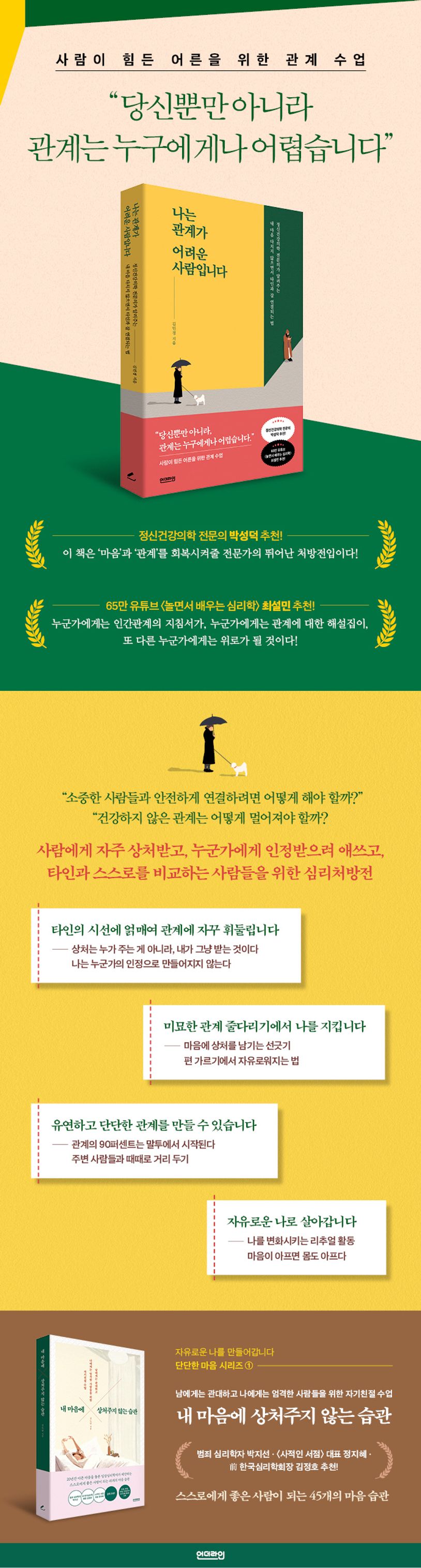 이 책에는 관계를 유독 힘들어하는 사람들의 특징과 상처받은 마음을 씻어내는 법을 설명하고, 안전하지 못한 관계는 끊어내고 건강한 관계를 맺는 방법을 구체적인 사례를 통해 알려준다. 또한 더 이상 사람에게 휘둘리지 않기 위한 단단한 마음을 만드는 법도 구체적으로 보여준다. 저자의 수많은 경험과 그 경험으로부터 나온 공감과 따뜻한 조언이 관계에 지친 이들에게 위로와 해결책이 되어줄 것이다.