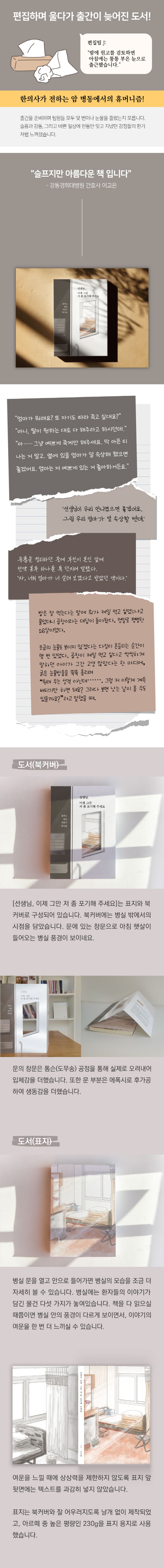 『선생님, 이제 그만 저 좀 포기해 주세요』 는 억울하고 외로운 싸움을 해나가는 말기 암 환자들의 이야기입니다. 말기 암이라는 현실을 받아들여야 했던 절망, 삶의 끝자락에서의 인생에 대한 회고, 그리고 두려움 속에서도 웃고 사랑하는 이야기입니다.