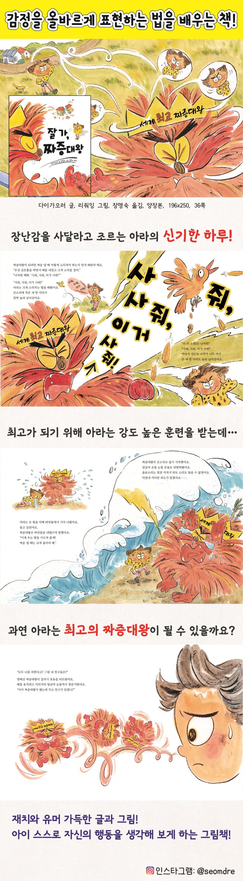 아라는 짜증을 잘 내요. 울면서 소리 지르고, 뒹굴고, 고집을 피웁니다. 어느 날 아라는 세계 제일의 짜증대왕을 만납니다. 털북숭이 괴물 짜증대왕은 아라를 최고로 만들기 위해 각종 훈련을 시킵니다. 아라의 짜증은 별것 아니라고 말하면서 더 크게 소리 지르고, 더 높이 던지고, 더 심하게 울고 뒹굴도록 강도 높게 훈련시키지요. 아라는 과연 혹독한 훈련을 마치고 세계 최고의 짜증대왕이 되었을까요?