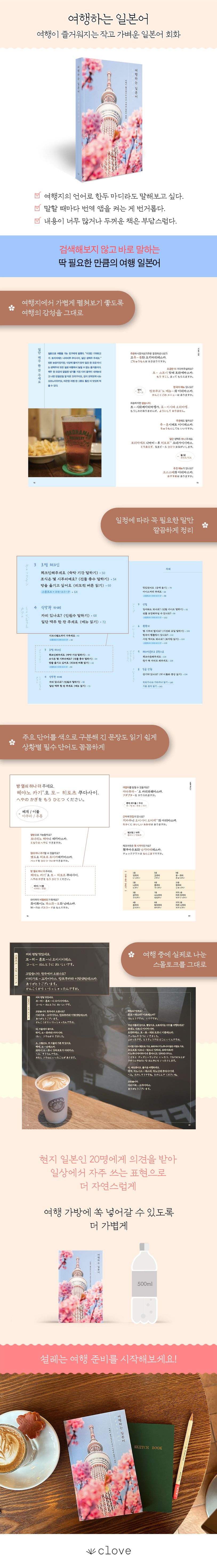 여행지의 언어로 말해보는 경험은 여행의 큰 재미 중 하나다. 그렇다고 여행 전에 시간 내서 외국어 공부를 하기에는 부담스럽고, 말할 때마다 스마트폰을 들고 번역 앱을 실행시키는 것도 생각보다 번거로운 일이다. 〈여행하는 일본어〉는 여행 일정에 따라 꼭 필요한 말만 깔끔하게 정리한 책이다. 비행기 또는 현지에서 이동 중에 펼쳐 보고 몇 마디씩 연습하기 좋다. 현지 일본인 20명에게 의견을 받아 일상에서 자주 쓰는 자연스러운 표현을 담았으며, 주요 단어를 색으로 구분해 긴 문장도 읽기 쉽도록 했다. 또한 감성적인 디자인으로 작고 가볍게 만들어 여행 중에도 기분 좋게 펼쳐볼 수 있는, 진짜 여행용 회화책이다.