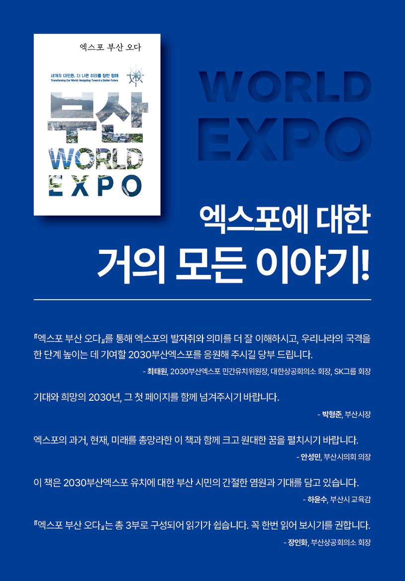 ‘부산엑스포 키즈’인 우리 청소년들이 엑스포에 좀 더 많은 관심을 뒀으면 하는 바람과 시민들이 알아야 할 엑스포의 과거·현재·미래를 한 권의 책으로 묶었습니다. 국제신문과 (사)금융도시부산포럼이 공동으로 국제신문에 연재된 엑스포 관련 기획기사를을 모으고 추리고 보완했습니다. 청소년과 시민들이 이 책을 읽으며 꿈과 상상력을 키우고 대한민국과 부산의 희망찬 미래를 그려나가길 기대합니다. -머리말 중에서
