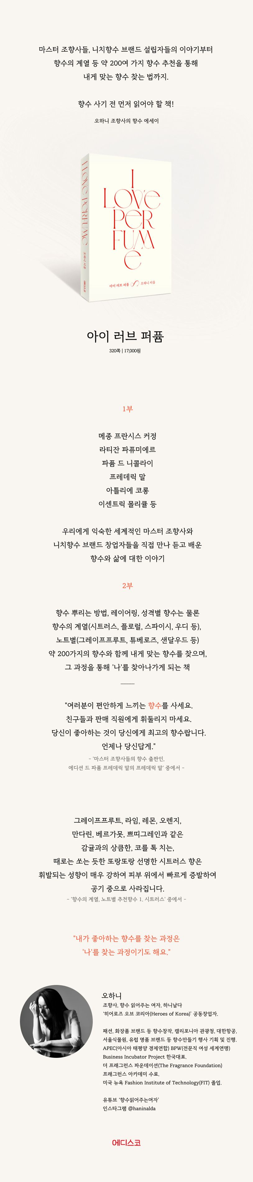 오하니 조향사의 향수 에세이 『아이 러브 퍼퓸』은 향수에 대한 애정과 함께 향수를 통해 삶을 더 사랑하는 방식이 담긴 책이다. 이 책은 ‘향’이 우리 안의 잊힌 기억과 감정을 만나게 하고, ‘나’라는 정체성을 찾아가는 데 귀중한 도구로 소개되고 있다는 점에서 특별하다.