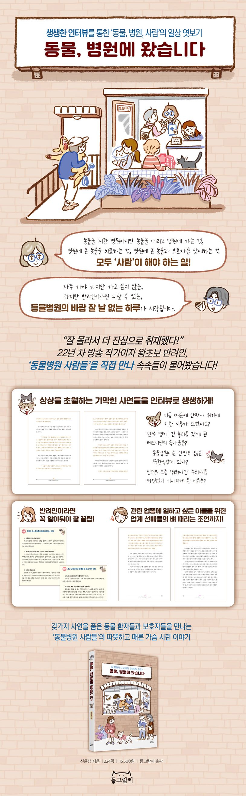 ‘동물병원’은 동물이 아프거나 병을 예방하기 위해 가는 곳이지만, 사실 그 주어는 ‘사람’이다. 사람이 동물을 데리고 병원에 가고, 사람이 동물의 병을 치료하며, 사람이 동물을 돌보는 곳이기 때문이다. 저자는 바로 그런 ‘동물병원의 사람’에 집중한다. 병원에 오는 동물들의 다양한 사연을 소개하는 데 그치지 않고, 그들을 치료하고 돌보는 수의사, 수의 테크니션, 리셉션 매니저를 직접 만나 그 지난한 과정을 인터뷰한다. 동물병원에서 일한다는 게 어떤 것인지 잘 몰랐고, 또 내심 궁금했다면 그들이 풀어놓는 진솔한 이야기에서 색다른 재미와 감동을 느낄 수 있을 것이다.