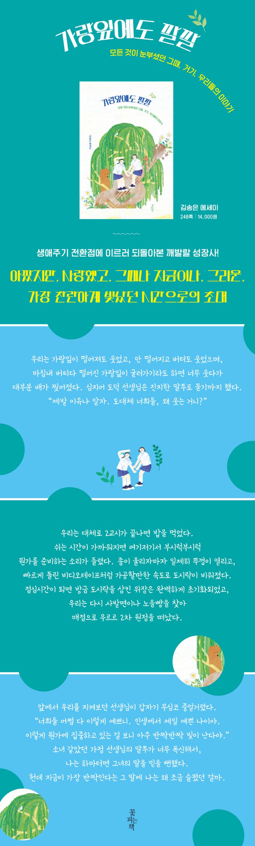 ‘어린이에서 어른으로 변화하는 과도기’라거나 ‘거친 바람과 성난 파도 같은 성장기’라고 불리는 시절로부터 길어 올린 유쾌하고, 아프고, 슬프고, 사랑스러운 이야기가 이 책 속에는 가득하다. 작가가 정성스레 소환해낸, 독자를 자연스레 그 시절로 돌아가게 하는 세밀한 기억은 눈부셨던 순간들에 대한 헌사다.
