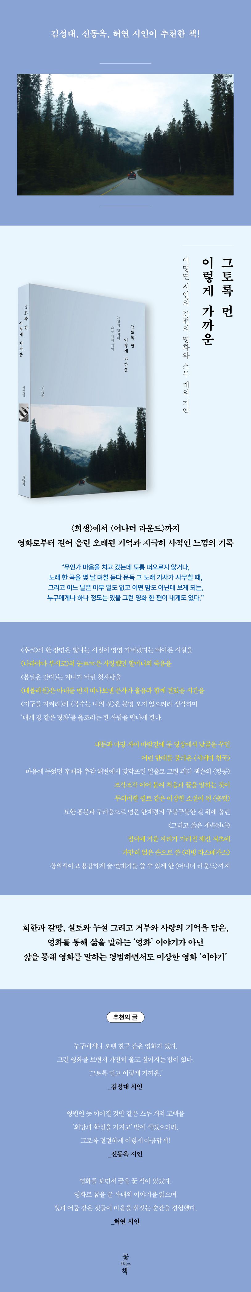책장을넘기자마자우리는작가가꼭꼭숨겨두었던마음깊은곳에가닿는다.그리고그곳에서왕가위와스티븐스필버그와압바스키아로스타미와피터잭슨과로베르트베니니와이마무라쇼헤이와크리스퍼놀란과쥬세페토르나토레와안드레이타르코프스키와로버트알트만과허진호와장준환과박찬욱이그린삶과인간과세계를만난다.우리는그렇게작가와함께,그가사랑했던장면들과함께,우리가종종그리워하는장국영과로빈윌리엄스와함께,그리고보르헤스와레이먼드카버와이성복과기형도와함께오래된기억을더듬고,지나간한때의느낌을떠올린다.우리는그렇게〈동사서독〉의백타산자락호숫가를산책하고,〈그리고삶은계속된다〉의끝나지않을듯한길을눈으로좇으며,〈지옥의묵시록〉속정글칼에떨어지는물소의목에다시한번마음을두들겨맞고,〈희생〉의알렉산더처럼“매일아침7시에일어나욕실로가서물을한잔받은후변기속에붓는일”을하는마음으로나무한그루를심는다.
