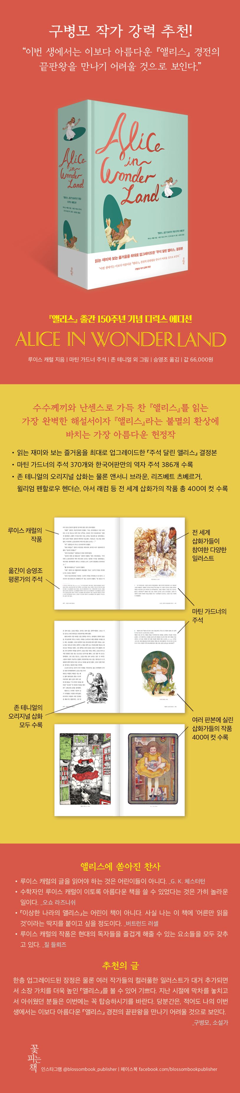 1865년 출간된 이후 무려 174개 언어로 번역되었고, 8,400판 이상을 찍었으며, 만화, 드라마, 연극, 영화, 뮤지컬 등 다양한 장르로 각색된 불멸의 판타지! 수많은 작가와 철학자, 심리학자는 물론 수학자, 물리학자에게까지 많은 영감을 주고 깊은 영향을 끼친 위대한 걸작! 성경과 셰익스피어 작품 다음으로 많이 언급되고, 수많은 문학 작품과 철학서는 물론 수학 및 물리학 이론서에 대사나 장면이 인용되는 심오한 정전!