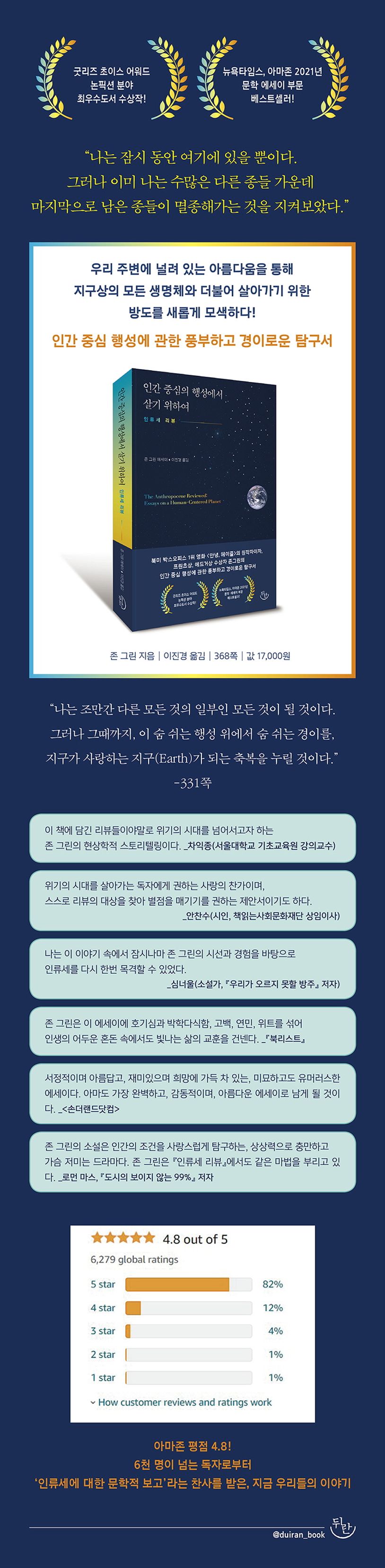 ‘인류세’는 인간이 행성과 생물종의 다양성을 쥐락펴락하는 현재의 지질시대를 일컫는 새로운 용어다. 인간이 지구라는 행성의 운명을 틀어쥐고 있는 시대를 뜻한다. 그러나 인류세가 지질시대라고 작가의 접근은 과학적인 것과는 거리를 둔다. 이 책은 ‘인류세’를 상징하는 지극히 인간적인 주제를 다루는 에세이 모음집이다. 캐나다기러기, 영화 〈마다가스카의 펭귄〉, 석양, 우리를 갈라놓고 우리를 하나로 묶은 세계적 감염병을 포함한 총 44꼭지의 풍부하고 흥미로운 그의 리뷰는 인류세를 넘어 더 나은 세계로 나아가기 위한 질문을 던진다.
