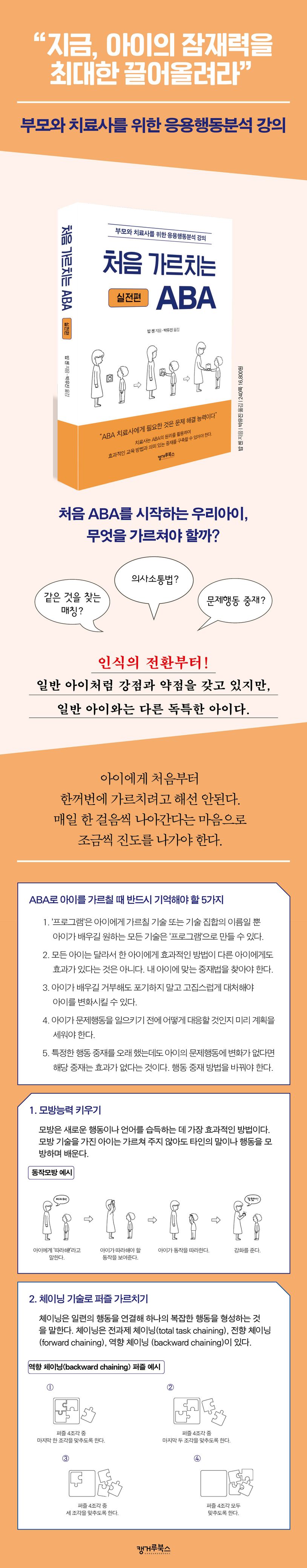 〈처음 배우는 ABA-이론편〉에서 자폐스펙트럼장애의 독특한 관점과 ABA의 이론을 소개한 응용행동분석가 밥 챈이 후속작인 〈처음 가르치는 ABA-실전편〉에서는 ABA로 발달장애아동을 가르치는 다양한 기술을 소개한다. 저자가 소개하는 ABA 기술은 치료 현장에서 아이들을 가르치면서 오랜 기간 축적한 다양한 경험과 노하우가 녹아 있다.