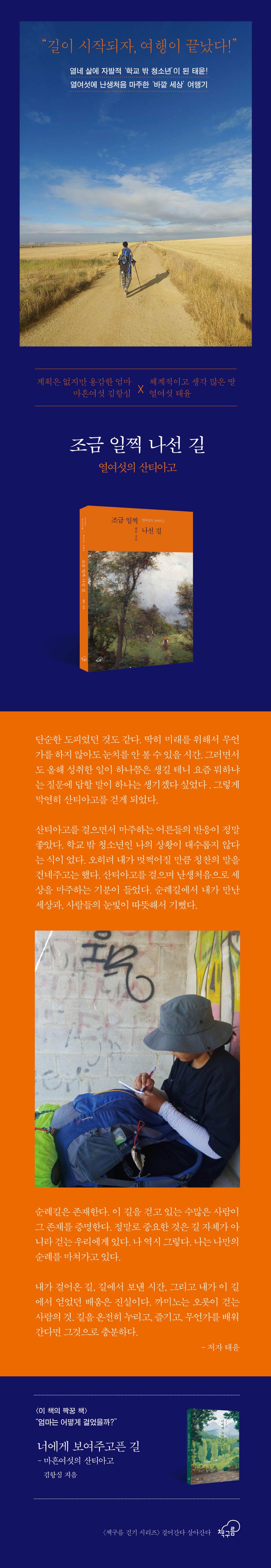 열네 살 소녀가 있었다. 책 읽기를 좋아하고, 운동이랑은 거리가 멀고, 친구를 좋아하는 보통의 날을 보내던. 그러다 중학교에 입학한 해 여름방학, 부모님 책상 위에 ‘홈스쿨링 계획서’를 올려놓고 스스로 학교 밖 청소년이 되었다. 자유롭게 배우고 다양한 경험을 하고 싶었다. 1년 만에 중·고등 검정고시를 끝냈다. 그러고 났더니 막상 할 일이 없었다. 사회에서 정한 틀대로 살기 싫어 선택한 길인데, 그것이 틀리지 않았음을 증명하려면 사회가 인정할 만한 성공을 해야 한다는 강박에도 시달렸다. 방구석에 틀어박혀 넷플릭스만 보는 날들이 이어졌다. 그런 태윤에게 부모 교육 전문 강사인 엄마가 산티아고 순례길 행을 제안했다.