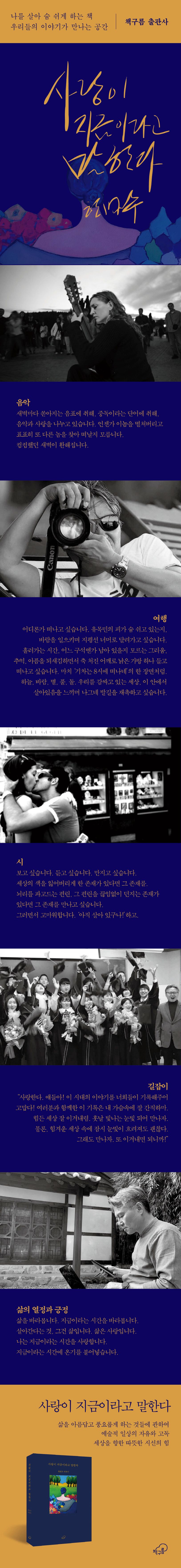 그의 생애를 관통하는 건 삶의 열정과 낙관적인 태도, 꾸준함, 그리고 세상을 향한 따뜻한 시선이다. 실패와 역경이 지난 뒤, 삶에 대한 사유는 더 깊어지고, 사랑은 그리움으로 남았다. 특히 저자의 담담하면서도 따뜻한 어조는 사랑과 감사로 채워가는 삶이 어떤 모습인지 가늠하게 한다. 아무리 힘들어도 온기와 희망을 잃지 않는다면, 사랑을 품을 수 있다면 그처럼 멋지게 나이들 수 있을지. 내면이 아름다운 인간으로 성장할 수 있을지. 사랑과 온기로 삶을 채우고 싶은 독자들에게 〈사랑이 지금이라고 말한다〉를 권한다. 책의 마지막 장을 덮은 뒤, “사랑이 지금이라고” 말하는 자신을 만날 수 있기를 기대한다.