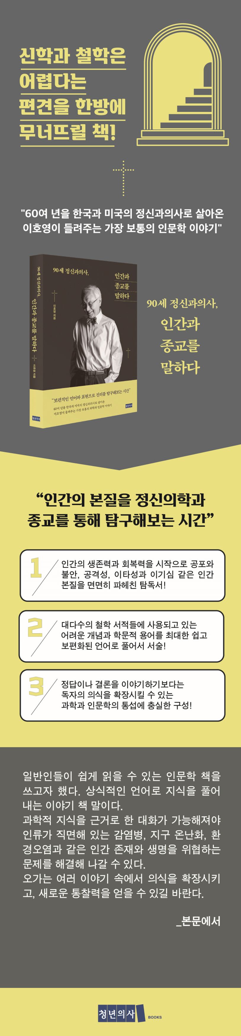 올해로 만 90세를 맞은 정신과의사이자 독실한 크리스천 이호영의 첫 대중서다. 《당주동 무화과나무》 이후 12년 만의 신간이다. 정신의학자로서는 다수의 저서를 펴냈지만 선생의 전문 분야인 정신의학을 철학, 종교 그리고 인문학과 접목시키는 글로는 처음 엮었다.